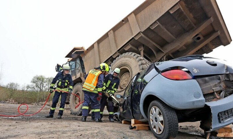 „Es war ein Horrorszenario“, titelte die Oberhessische Presse Marburg, nachdem die Feuerwehren der Großgemeinde Ebsdorfergrund und der Rettungsdienst Mittelhessen am vergangenen Samstag auf dem Betriebsgelände im Steinbruch Dreihausen einen Großeinsatz übten. Ziel der Übung war die Bergung und Rettung von mehreren verunfallten Personen. Drei PKW, einige Laiendarsteller und unser „Schätzchen“, der 40 t SKW, bildeten auf dem weitläufigen Gelände die Bühne für einen anspruchsvollen Rettungseinsatz. Als Ursache des Unfallgeschehens hatte das Drehbuch ein illegales Autorennen vorgegeben, bei dem die Fahrer lebensgefährliche Verletzungen erlitten haben und aus den Unfallwagen gerettet werden sollten. 19 angehende Notfallsanitäterinnen und -sanitäter des DRK -Rettungsdienstes Mittelhessens und Frankenberg sowie der Johanniter-Unfallhilfe Regionalverband wurden dabei mit dem „Schlimmsten“ konfrontiert und benötigten sowohl ihre Fachkenntnisse und gute Nerven als auch ganz besonders, gute Teamarbeit.